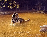 The majestic tiger is so involved with the delicate butterfly that the deer can safely
