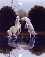 As the full moon reflects in the waters below, two horses dance under her light. Do