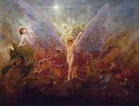 The radiant wings superimposed over a background of abstract and real beings - a fairy realm.