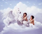 The cherubs are frolicking with the baby Pegasus in a bed of clouds while Mother looks on.