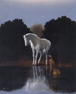 The white horse stands beneath the moon cloaked in her celestial light, contemplating the
